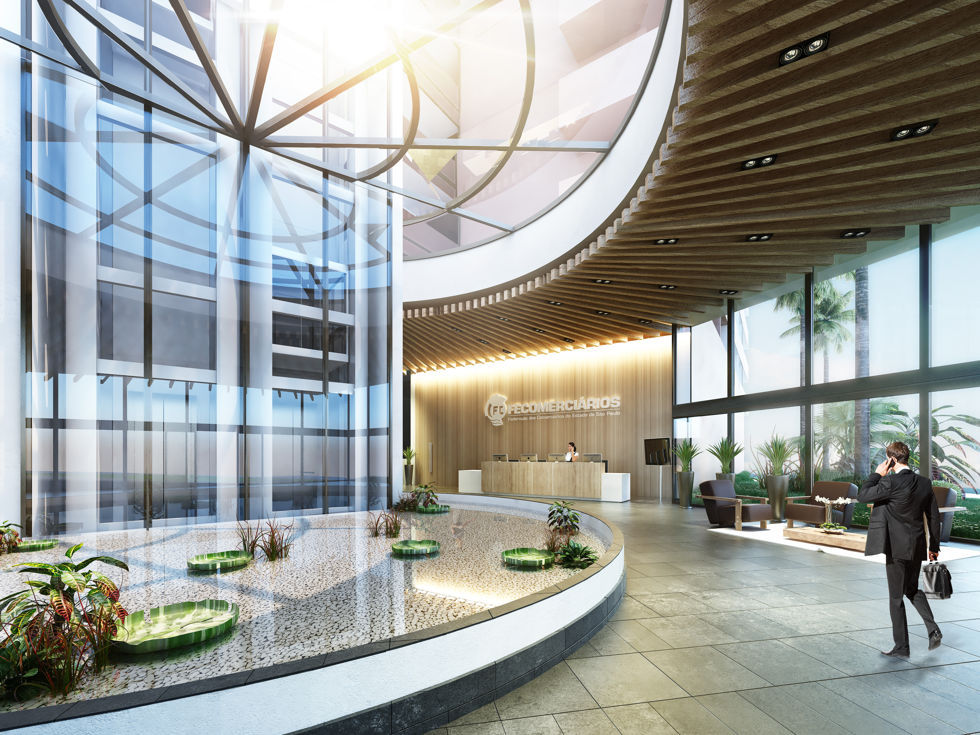 O espaço do Lobby estará integrado com a Recepção, as 04 salas de reuniões e a Cafeteria destinada aos hóspedes e ao público em geral.